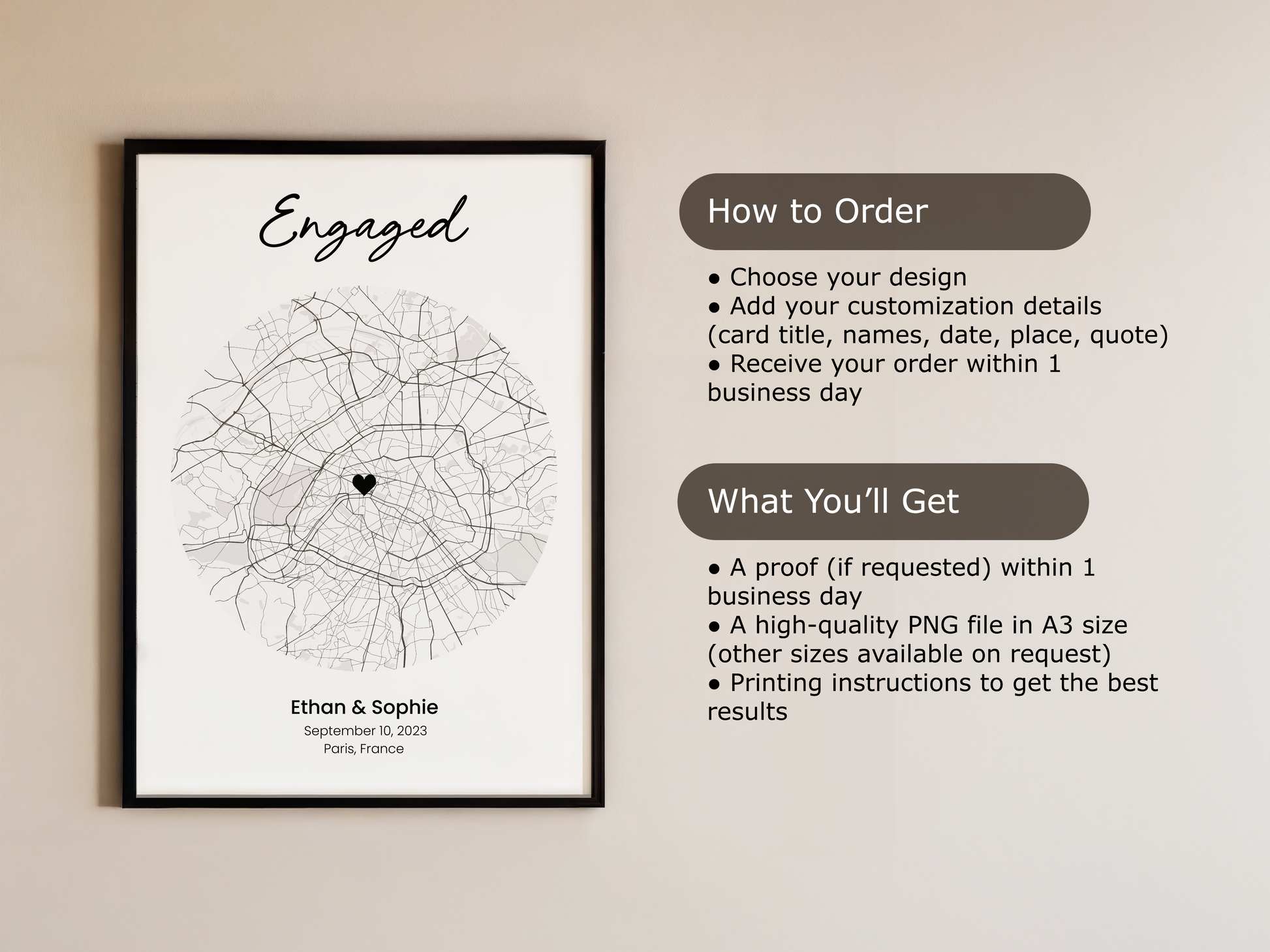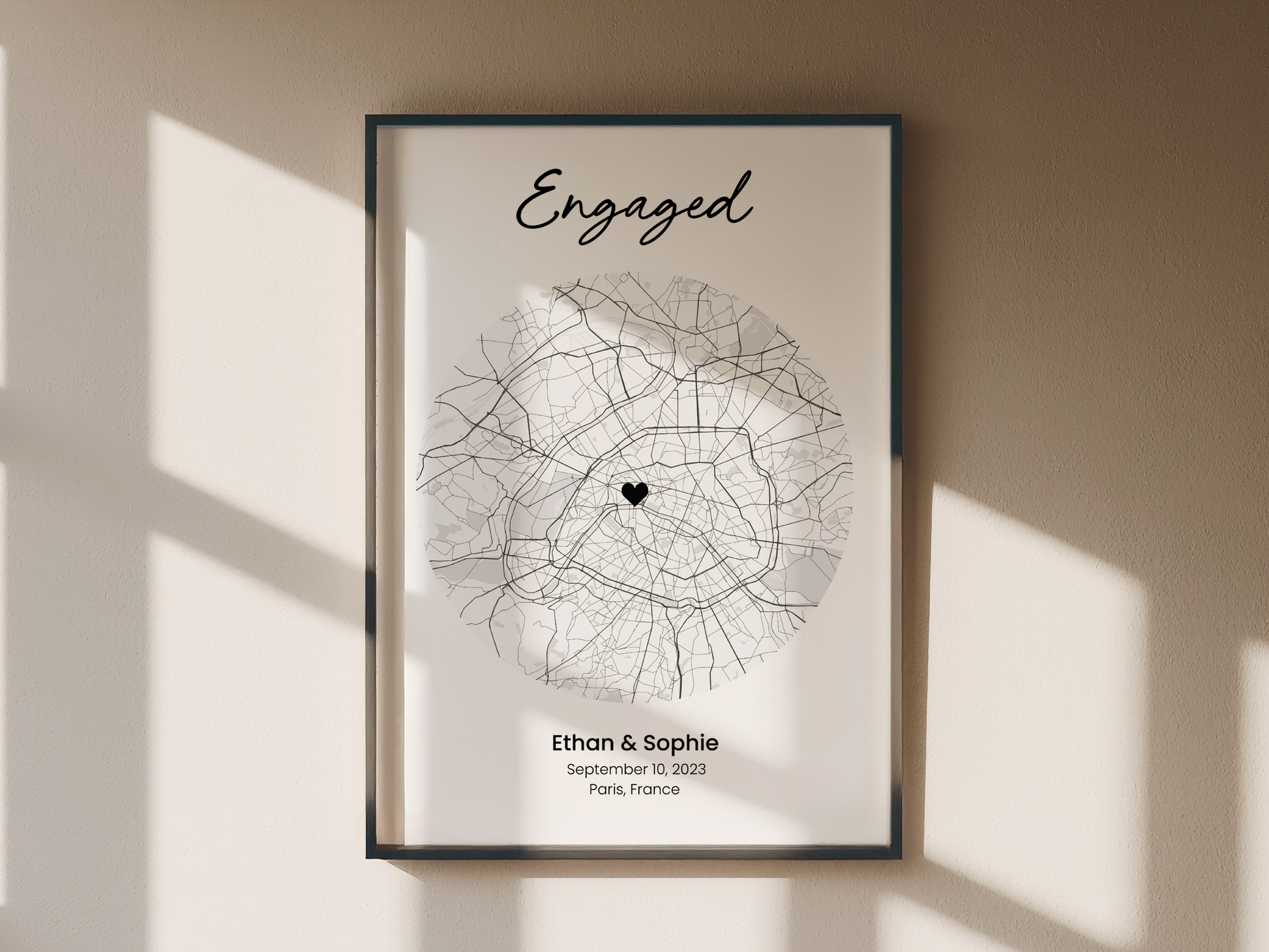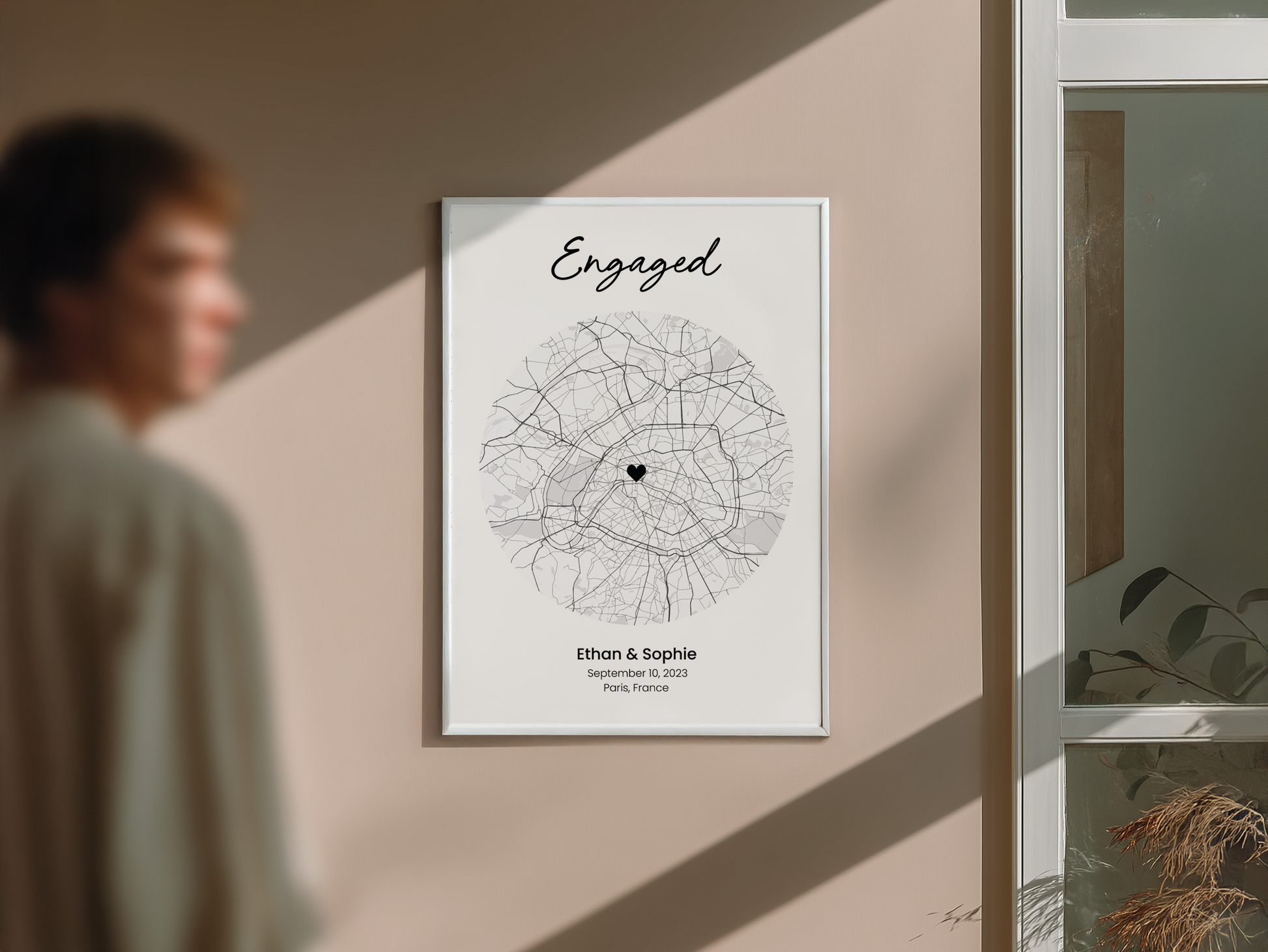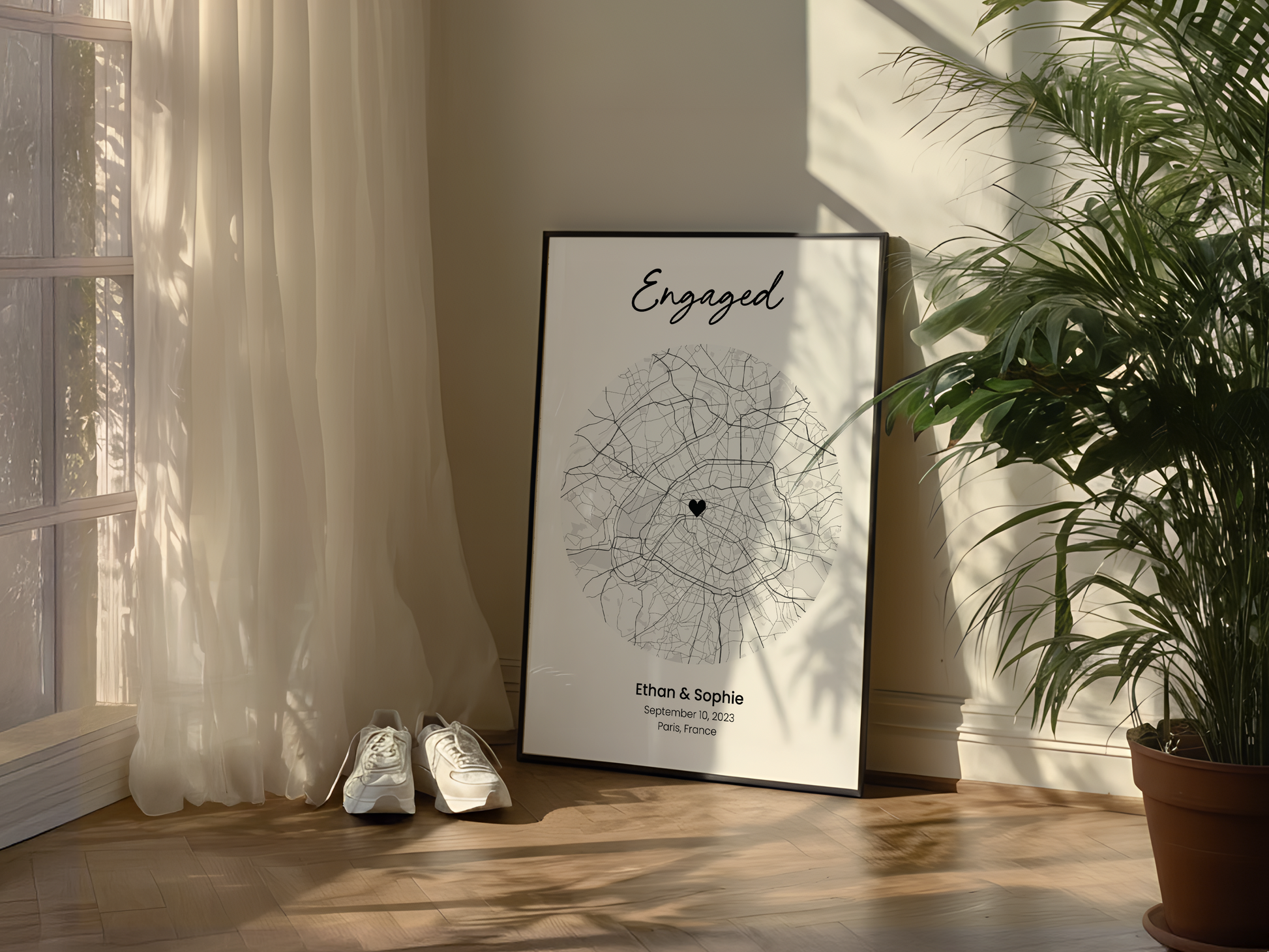 Celebrate your engagement with a beautiful and modern custom engagement map poster, designed to capture the exact spot where your love story took the next step. From the moment you said “yes” to forever, this elegant artwork transforms that location into a timeless keepsake.