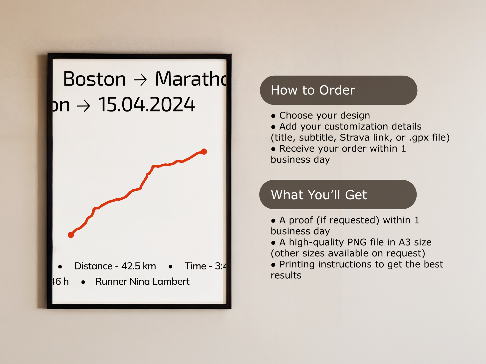 Every design is crafted with care to reflect your unique route. Our signature style is clean, bold, and minimal, perfect for any modern space. Please note: map appearance may vary slightly depending on terrain and road patterns.