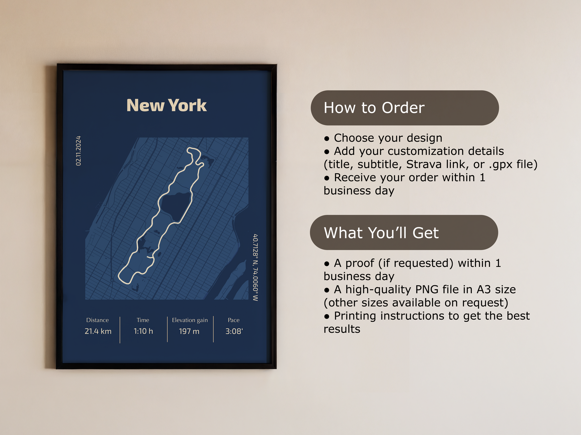 Whether you ran the streets of London, New York, Berlin — or a scenic trail captured on Strava — we can create a custom map for any route in the world.